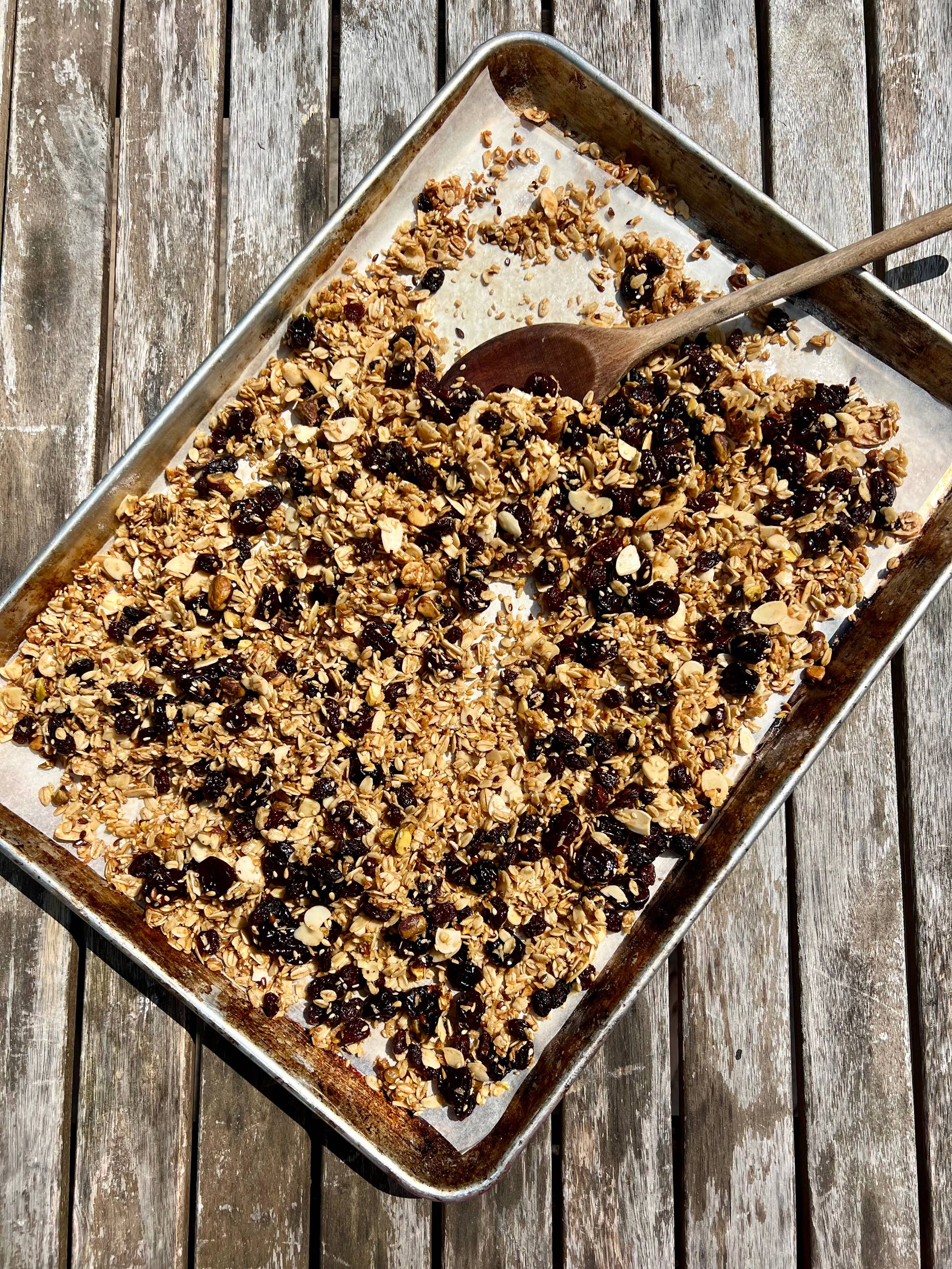 Once golden and fragrant, remove from the oven and let the granola cool completely on the baking sheet. This cooling process helps it achieve that perfect crunchy texture.