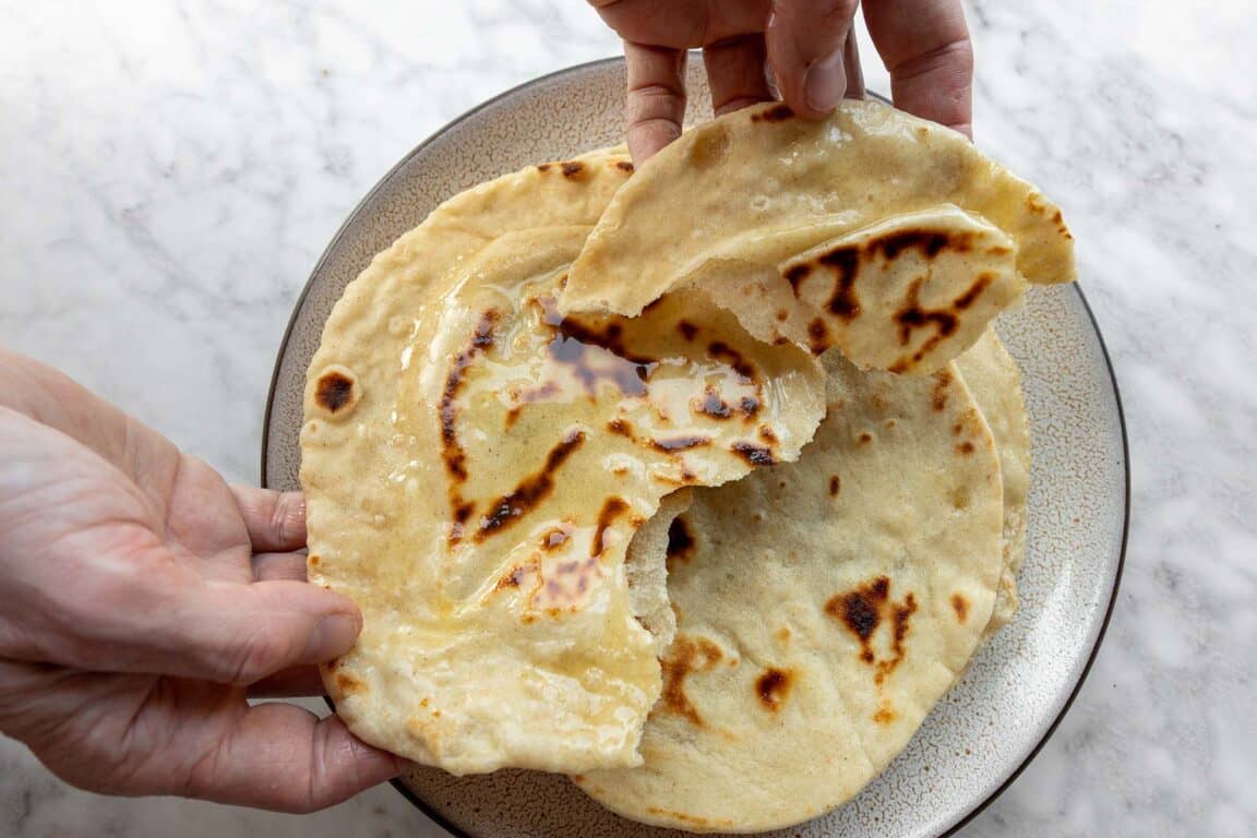 We’ve been making this naan a lot at home lately. It started because I wanted something easy the kids would actually eat with dinner, and now it’s become part of the rotation. I’ll make a batch, and the girls will take pieces in their lunch the next day with a little butter chicken or curry. It’s soft, warm, and one of those things that just makes a meal feel cozy, even on a busy weeknight.