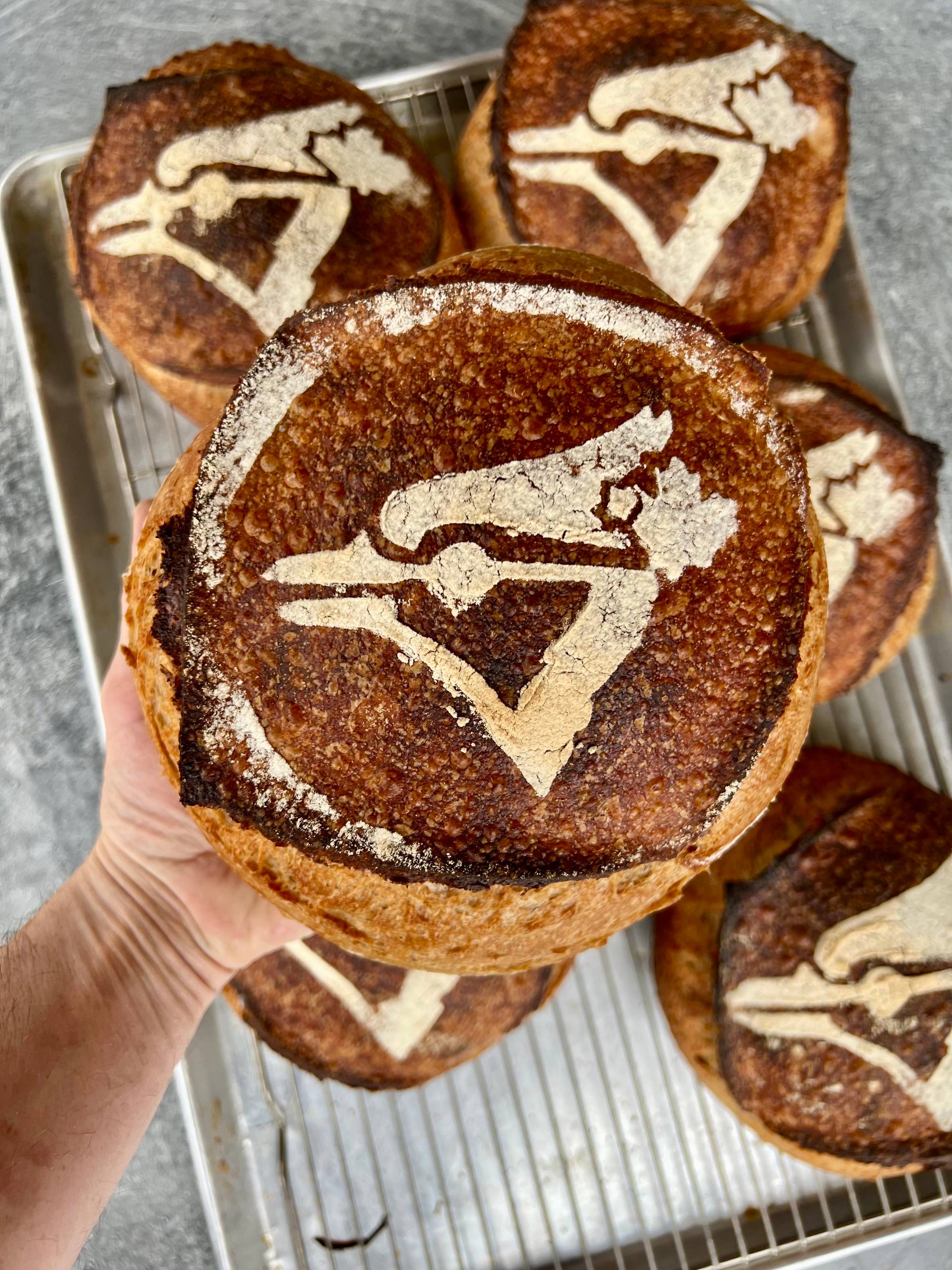 For Game 6 and Game 7, we baked Blue Jays stencil sourdough, and people went wild for it. Folks were picking up loaves on their way home to watch the game. The vibe was electric, flour everywhere, everyone hopeful, everyone in it.