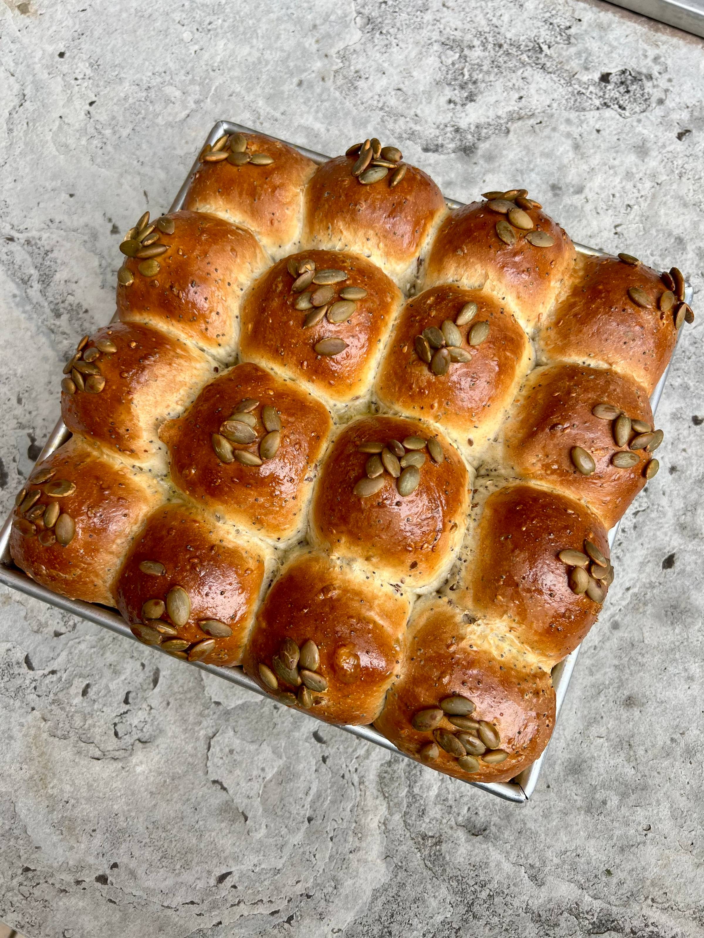 I baked 16 buns in a pan instead of 9, like in my book, and the result was this beautifully tall, pull-apart loaf that looked incredible on the table. The mix of seeds on top added a light crunch and nutty aroma that took them over the top.