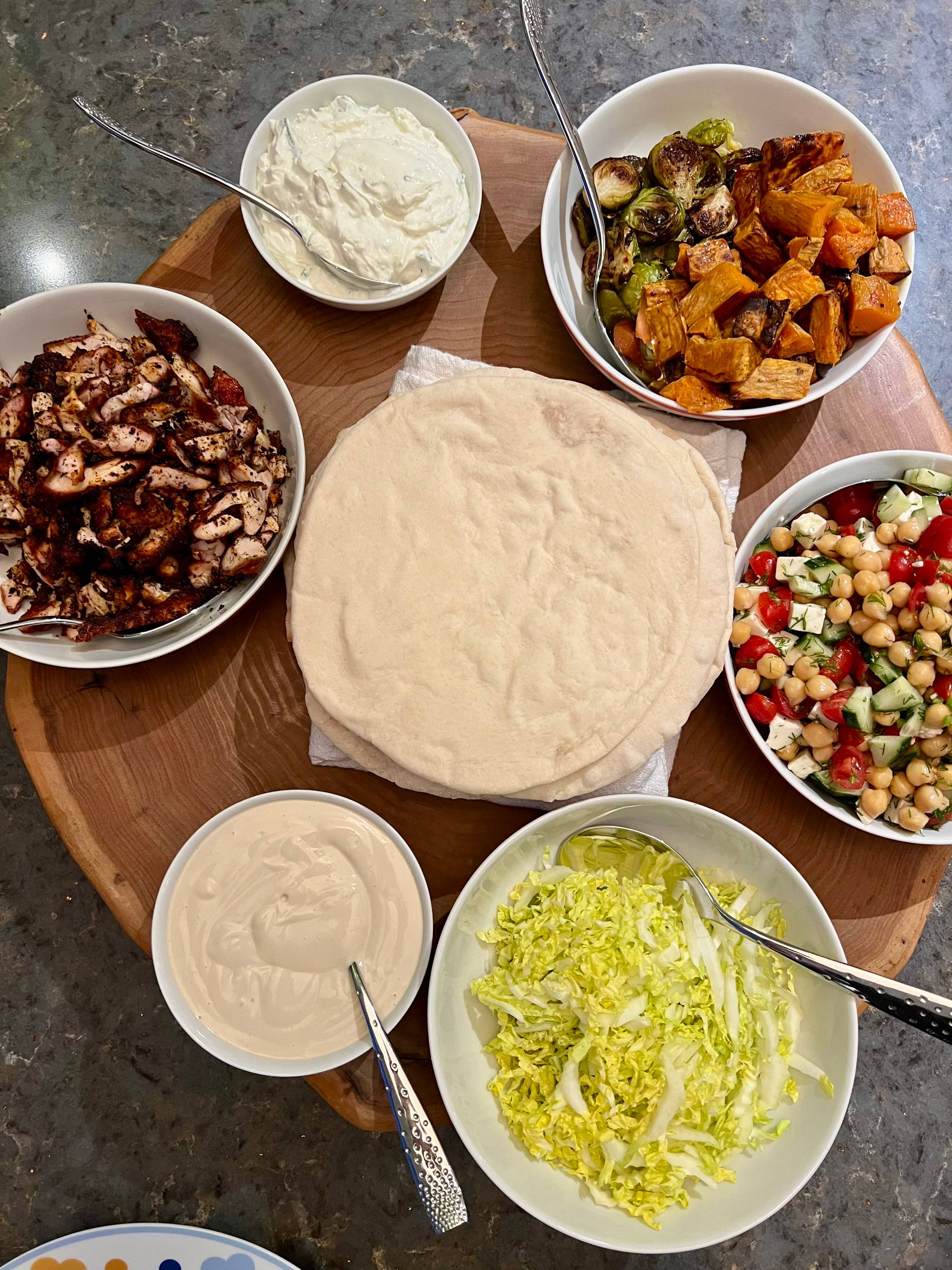 At work this week I made a batch and served it with smoked chicken, roasted brussels sprouts, roasted sweet potato, shredded cabbage, tomato, cucumber and feta salad, a tzatziki and a homemade tahini sauce. It was one of those meals that looks simple but hits every note. Warm pitas on the side just make the whole thing feel complete.