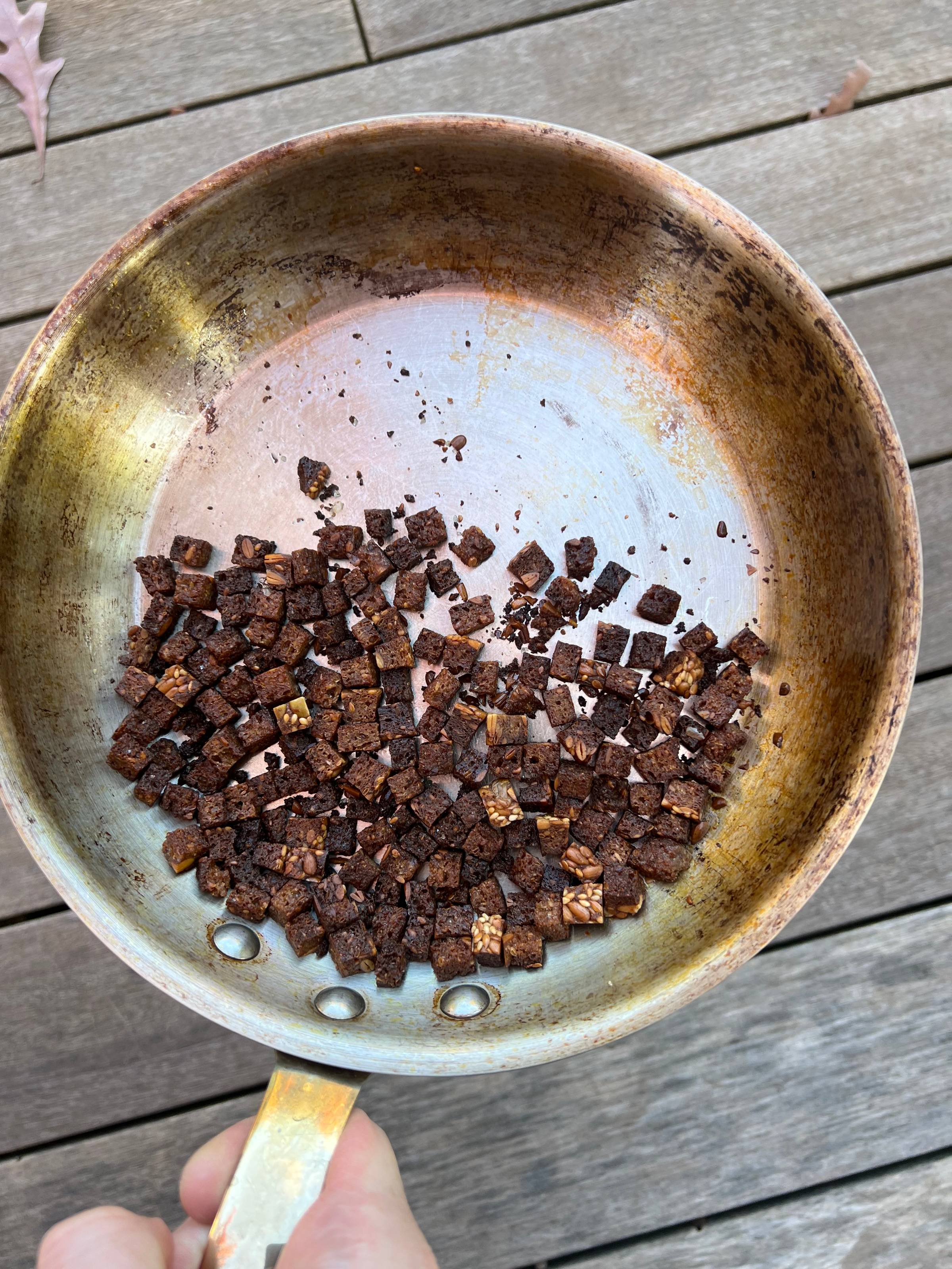I used my rugbrød (Danish rye bread) from Bread, Etc. as the base, cubed it up, and fried it gently in unsalted butter just as it started to foam not brown. From there, it’s all about movement: keep tossing the pan over medium heat until every side is evenly toasted. It takes a little care (and some chef reflexes), but the payoff is incredible.