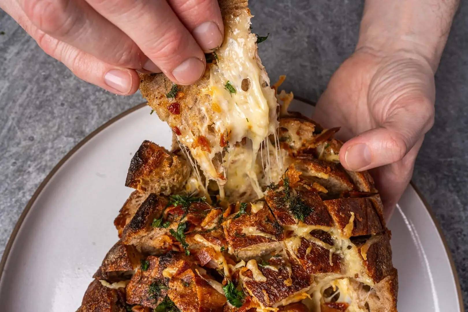 Take a crusty sourdough boule. Slice it into a diamond pattern. Stuff it with garlic butter, cheese, herbs, and bacon if you want. Bake until golden and bubbling. It’s melty. Crispy. Garlicky. Completely addictive.
