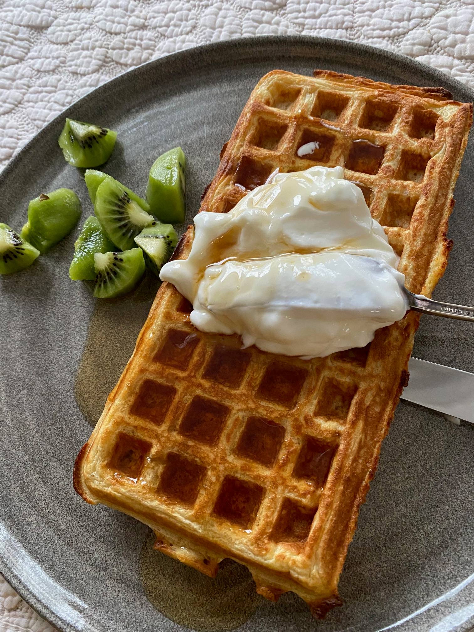 That’s the message I got this week from Kassie, along with a photo of a beautifully golden waffle topped with yogurt and maple syrup, with fresh kiwi on the side.